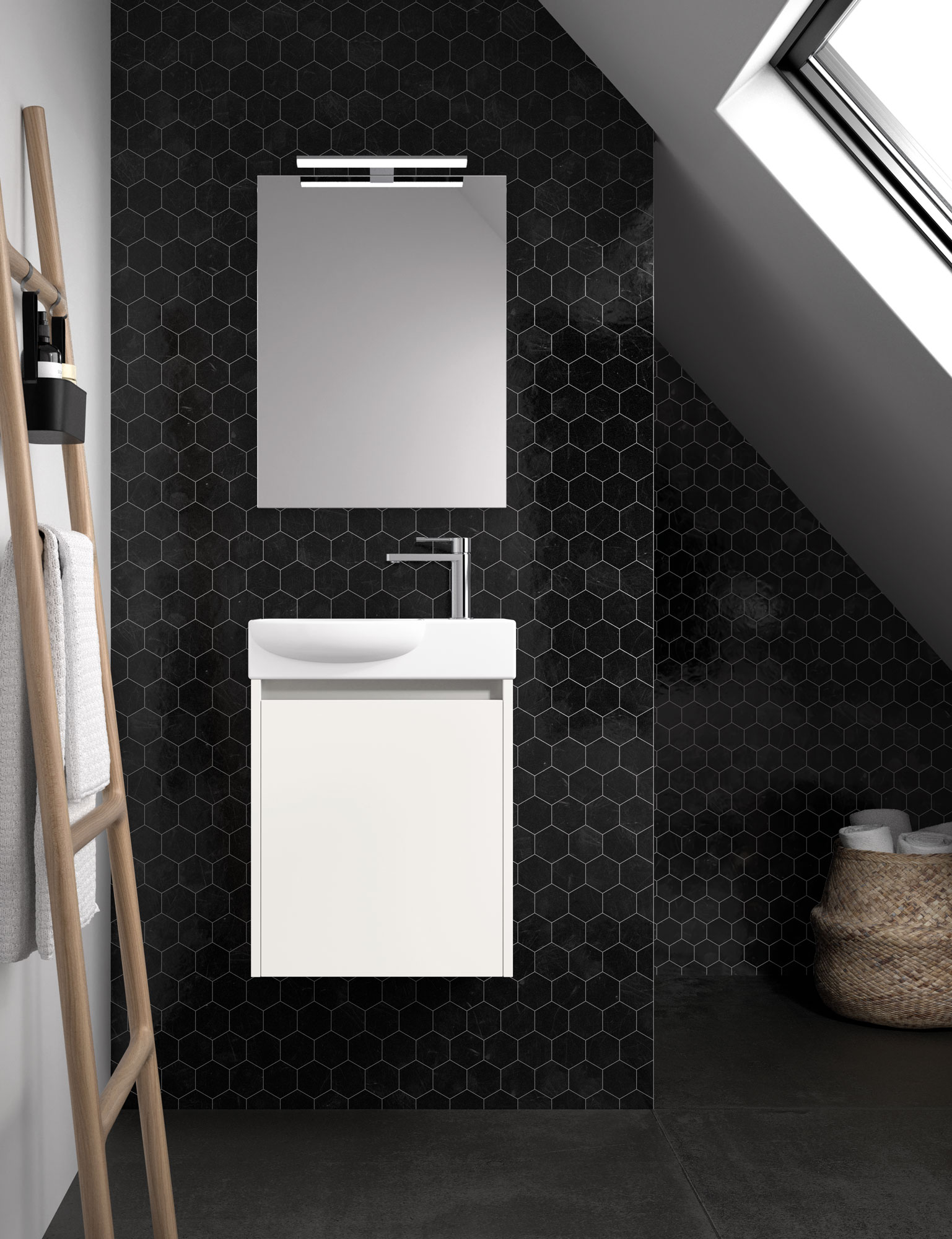 Una solución para el baño rápida, atractiva y cómoda. Un mueble de 45 cm de ancho sin necesidad de montaje. 4 acabados en melanina. Diseño actual. Lavabo de formas singulares. Entrega rápida en máximo 3 días.