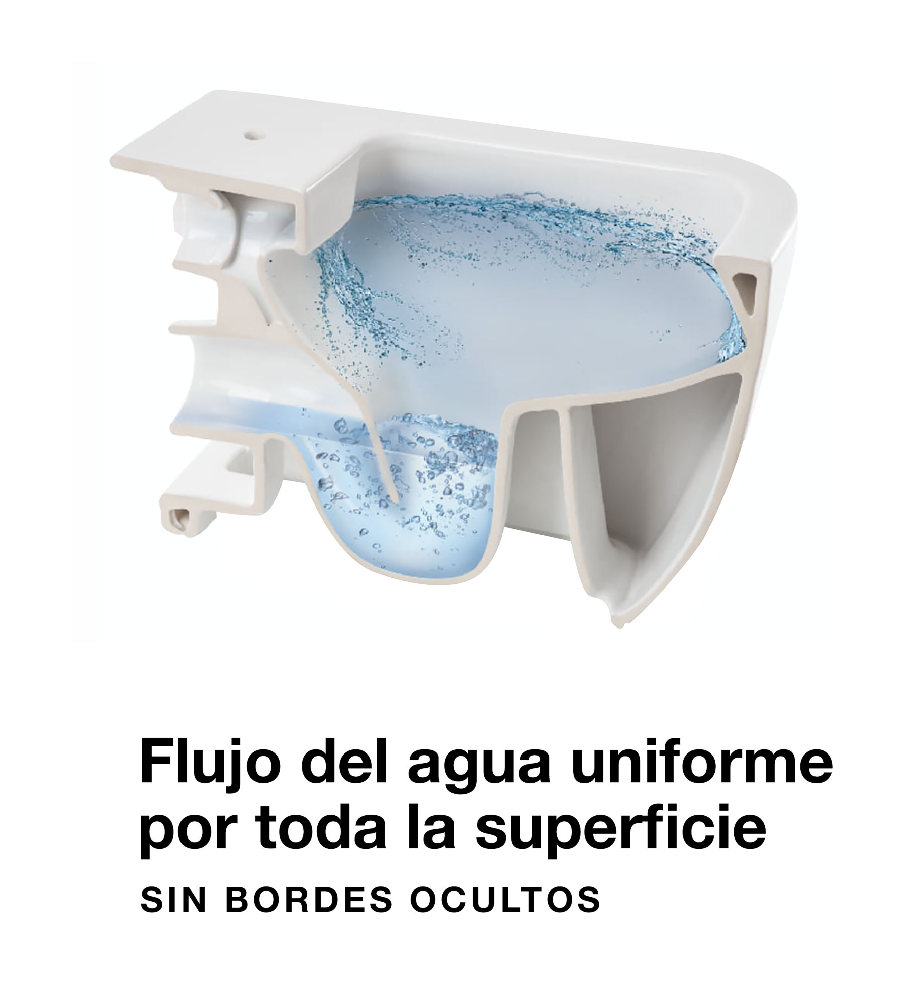 La tecnología RIMLESS permite una descarga más rápida y silenciosa con un flujo del agua que aborda toda la superficie y una reducción de agua utilizada de un 30%. El sistema RIMLESS evita bordes que limpiar por lo que no hay lugar para poder albergar gérmenes